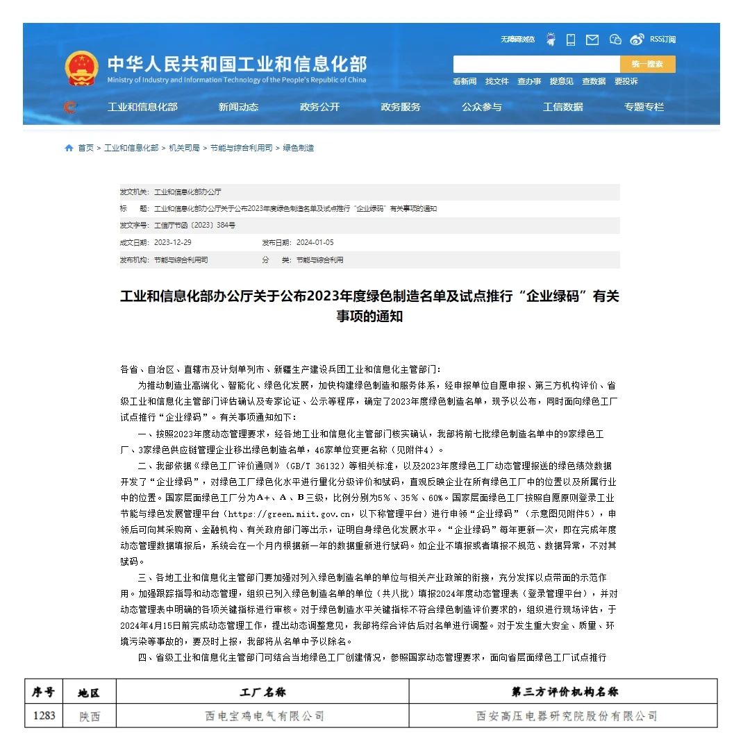 近期,國家工業(yè)和信息化部公示2023年度綠色工廠名單,中國西電集團(tuán)所屬西電寶雞電氣成功入選。